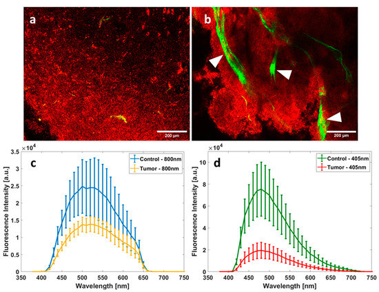 On the other hand, Figure 2c shows the mean fluorescence intensity spectra generated using 800 nm as the excitation wavelength for control and tumor tissues while Figure 2d shows the mean fluorescence spectra of both tissue types using 405 as the excitation wavelength. Differences in spectral shapes and in the intensity of the emitted fluorescence could be easily noticed, comparing 405 nm and 800 nm spectra of the two tissue types.