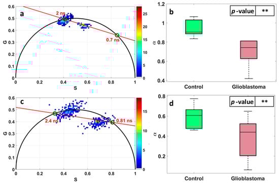 Figure 3 illustrates the fluorescence lifetime imaging histogram represented using the phasor approach applied to flavins (FAD) and nicotinamide adenine dinucleotide (NADH), respectively (a,c), and the corresponding repartition of the long lifetime contribution for each of the tissue types (b,d). In fact, every pixel generated from the fluorescence lifetime images is displayed as a coordinate on the phasor plot and, using the Fourier transform, the G and S coordinates are calculated [31,32]. The semicircle present in Figure 3a,c represents the universal circle into which pixels with single exponential decays fall. Looking at Figure 3a, which represents the phasor applied to FAD, one can detect two histograms that comply within the semicircle. The phasor falls within the line that passes through these two histograms maxima with average fluorescence lifetime values of 2 and 0.7 ns, respectively. From that, one can extract the alpha coefficient (which represents the long lifetime intensity fraction α) for each of the samples in question. This repartition is observed in Figure 3b,d for both tissue types and FAD and NADH. For FAD, the control group shows α coefficients strictly larger than 0.8 and the tumor group shows α coefficients strictly smaller than 0.8 with a p-value = 4.87 × 10−8 < 0.05, while for NADH there are fewer differences between the control group and tumor, but it is still significant with a p-value = 7.2 × 10−3 < 0.05.
