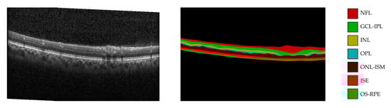 The proposed model is based on an improvement of the TransUNet model. In OCT images, nerve fiber layer (NFL), ganglion cell layer to inner plexiform layer (GCL-IPL), inner nuclear layer (INL), outer plexiform layer (OPL), outer nuclear layer to inner segment myeloid (ONL-ISM), inner segment ellipsoid (ISE), outer segment to retinal pigment epithelium (OS-RPE) and background for eight-level semantic high-precision segmentation operation were analyzed. An example of the OCT images and their corresponding annotations are shown in Figure 1.