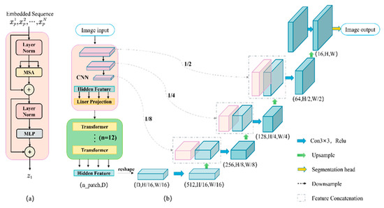 The Transformer’s structure as shown in Figure 2a. A Transformer consists of layer norm layer, multihead self-attention module (MSA), and multi-layer perceptron (MLP). The TransUNet network structure is shown in Figure 2b, which is a U-shaped encoder-decoder architecture. The strategy in the encoder part is to build the encoder in a mixture of CNN and Transformer, which can take advantage of the advantages of Transformer and CNN, respectively. Due to the self-attention structure of the Transformer network, it pays more attention to global information, and is easy to ignore the details of the image under low resolution, which will cause great damage to the decoder, which recovers the pixel size and leads to rough segmentation results. CNN can just make up for this drawback of the Transformer. CNN can extract local detail information better, so TransUNet combines the two for image segmentation.