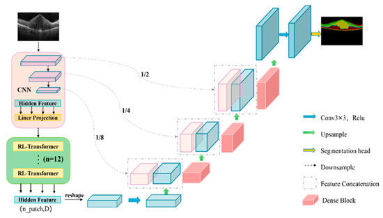 In this paper, a novel lightweight TransUNet deep semantic segmentation network model was constructed for the intraretinal layer segmentation for fundus OCT image. The OCT dataset was augmented to improve the generalization of the model, and the Transformer was improved to an RL-Transformer to enhance the perceptual field and improve the coding ability of the model. Furthermore, changing the decoding layer to Dense Block could not only prevent the gradient explosion problem, but also better retain the context information, enhance the feature reuse, reduce the learning parameters, and reduce the computational burden. The SD-OCT and POne datasets are used to validate the model, and SD-OCT is a public dataset of Duke University. In recent years, Transformer is used in a variety of different medical image segmentation fields, and the application of Transformer in the field of retinal layer segmentation has also achieved good results. Subsequent work and research will focus on the research and implementation of fluid segmentation in choroidal and retinal diseases [29] and the lightweight of models [30].