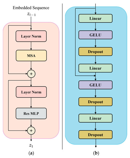 In this paper, the MLP in Transformer was changed into ResMLP, that is, the new Transformer (RL-Transformer) [24], and it was used in the proposed network. The structure diagram of RL-Transformer is shown in Figure 4a, which consists of Layer Norm layer, Multihead Self-Attention module (MSA), and ResMLP. The structure of the mentioned ResMLP is shown in Figure 4b.