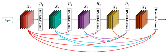 The Dense Blocks are derived from the DenseNet network, which contains better dense connections than the simple ResNet model [26]. The framework diagram of the Dense Block model is shown in Figure 5, which is a Dense Block with five layers, including four combination functions BN(Batch Norm)-ReLU-Conv and the Transition Layer. Where the input to H1 is X0 (the input), the input to H2 is X0, X1 (X1 is H1’s output), and so on. It consists of two main parts, the dense block and the transition layer. The Dense Block mainly defines the connection relationship between input and output, and the transition block is mainly used to control the number of channels.