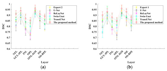 First, taking expert 1 as the golden annotation, from the average of the overall Dice coefficient, the overall Dice coefficient of the proposed algorithm is 0.904, which is better than the four methods of U-Net, ReLayNet, Swin-Unet, and TransUNet 0.079, 0.062, 0.043, and 0.023, respectively. At the same time, it is also superior to the above four methods in the Dice coefficient score of each layer. In particular, there is a large improvement in Dice coefficient scores in the INL and OPL layers. Therefore, from the perspective of Dice coefficient, the hierarchical results of the proposed algorithm are better than those of other methods, and the segmentation accuracy of each layer is improved.