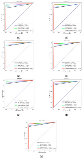 As shown in Figure 7, Figure 7a–g show the ROC curves of the results of this paper’s method (red line) and four other methods for segmenting the intraretinal layers of fundus OCT images in each layer, respectively. For different layers, the AUC values of different methods are shown in Table 3.