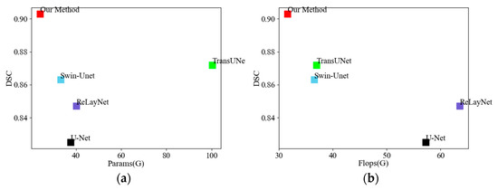 Figure 10 shows (a) the results of comparing the number of parameters between this paper’s model and the comparison model, and (b) the results of comparing the computational volume between this paper’s model and the comparison model. The y-axis represents the DSC value (the higher the better), and the x-axis represents the Params (M) and Flops (G) (the lower the better), respectively. It is seen that the method proposed in this paper has the lowest Params and Flops values, while the DSC values are also higher than the other models, indicating that the method in this paper is faster and more accurate than the other methods in segmenting the intraretinal OCT images.