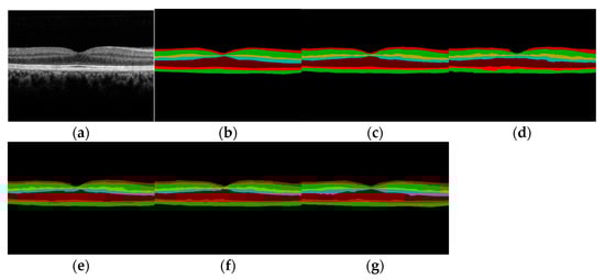 As shown in Figure 9, the visualization result plot of the ablation experiment is illustrated. Figure 9a shows an original retinal OCT image with diabetic macular disease. It can be seen that the foveal area of the macular is obviously raised, and there are multiple cystic lesions with different sizes and irregular structures. Subfigure (c) shows the predicted layer segmentation result of baseline 1, and it can be seen that there are errors at the segmentation of INL and OPL layers, indicated by a white arrow in the figure. Subfigure (d) shows the predicted layer segmentation result of baseline 2, which is greatly improved compared with baseline 1, but there are still shortcomings in the left boundary and lesion area of the first layer. Subfigure (e) is the predicted layer segmentation result of baseline 3, and subfigure (f) is the predicted layer segmentation result of the proposed method. It can be seen that the boundary of the segmentation result is smooth and continuous, and it also has a good segmentation effect on the macular foveal lesion area.