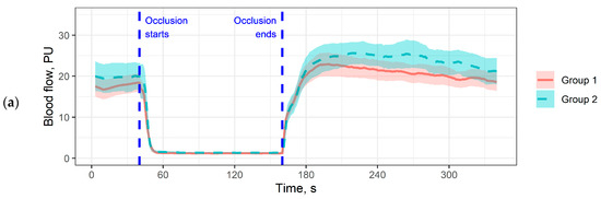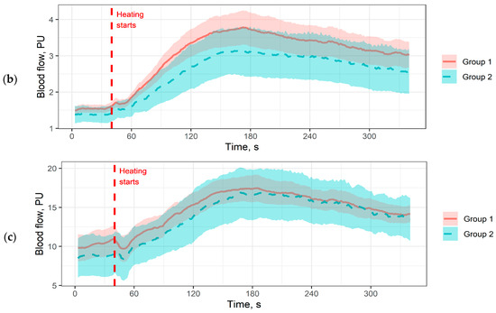 Our results on the dorsum of the foot are consistent with both the literature data [26] and the results we obtained earlier [15,27]. We noted a decrease in the reactivity of the microcirculatory bed in patients with severe microangiopathies (Group 2) (Table 2, Figure 1b). The fact that significant differences between the groups were obtained only in the first minute of heating may be due to a different measurement localisation (we used to take measurements on the forearm) and low signal amplitude.