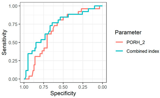 To assess the diagnostic informativeness of the parameters from Table 2, an ROC analysis was performed. The maximum area under the ROC curve (95% CI) was obtained for PORH_2: 0.672 (0.561–0.783), corresponding to poor prognostic power [20]. However, combining the two indices and calculating a composite index by building a logistic regression model (2) increased the diagnostic informativeness of functional tests (Figure 2).