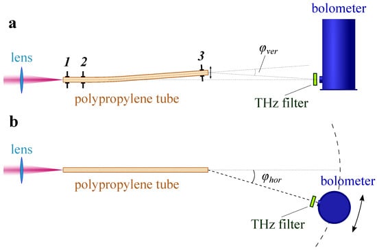 For potential applications, it is important not only to obtain narrow-angle emission pattern, but also to have an opportunity to control its direction. To test the direction control, we carried out an experiment, the scheme of which is shown in Figure 4a. In this experiment, we used a polypropylene pipe similar to the previously used one, but smoothly bent by the angle of (radius of curvative ∼25 cm). The measurements of the angular distribution of terahertz radiation were carried out according to the method described above; the bolometer was rotated around an axis passing through the output pipe end (Figure 4a). The angular distribution of terahertz radiation with frequencies of 0.5 and 1 THz is shown in Figure 4b,c. As in the experiment with the straight pipe, the main maximum was located on the axis, but in this case, two additional maxima appeared in the horizontal (i.e., bending) plane. The amplitude of one of them was comparable to the main maximum, and the amplitude of the second was much lower. Apparently, the appearance of the additional maxima may be due to the reflection anisotropy in the bending region.