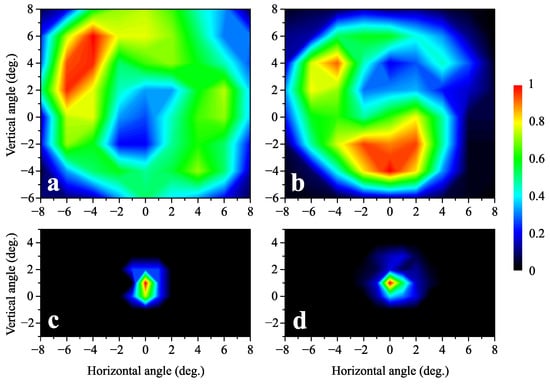First, before installing the pipe, we studied the angular distribution of terahertz radiation generated by a single-color filament plasma. Laser pulses with energy of 3 mJ were focused by the spherical mirror with a focal length of 1 m. In this case, we have a single-filament mode of laser propagation. Figure 2 shows the angular pattern of terahertz radiation with frequencies of 0.5 (a) and 1 THz (b). At higher frequencies (namely, 3 THz) the signal-to-noise ratio was close to unity. The measured angular distributions (Figure 2) had a ring-shaped structure. As described in [8], higher terahertz frequencies propagated into the smaller angles. Then, we measured the patterns in the presence of the pipe. In this case, the angular distribution of terahertz radiation had a unimodal structure (Figure 2c,d), i.e., instead of the original hollow cone, a narrowly directed terahertz beam was observed. If the pipe was removed in this experimental geometry, no signals were observed on the bolometer. Further, we made sure that the obtained patterns persisted in the case of tighter focusing, at which the terahertz radiation propagates at larger angles, so the expected difference between the angular distributions with and without the pipe was even more significant.