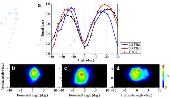 For that purpose, we focused our laser beam with pulse energy of about 10 mJ for the lens with the focal length of 20 cm. In this case, we had several plasma channels (multi-filament mode). Figure 3a shows the angular distributions of terahertz radiation in the horizontal plane at frequencies of 0.3, 0.5, and 1 THz. At all frequencies, we observed a two-maxima structure with a minimum on the axis, which likely indicates that terahertz radiation propagates in a hollow cone. The distributions of terahertz radiation obtained for the same frequencies after the pipe are shown in Figure 3b–d. As in the milder focusing case, the terahertz radiation after the pipe had a unimodal distribution at all considered frequencies. If the initial cones had opening angles of more than (Figure 3a), then after the pipe, the width of the angular distribution of terahertz radiation at the ½ level was about (Figure 3b–d). Therefore, despite the significant difference between the initial angular patterns of terahertz emission under different focusing conditions, the unimodal structures formed by the pipe were qualitatively the same.