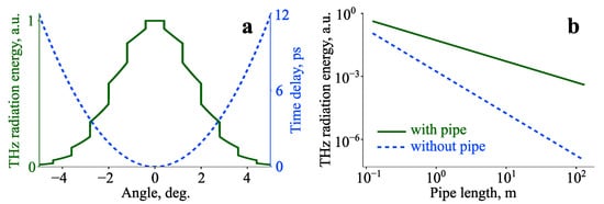 Since the terahertz radiation propagated in the pipe’s hollow part, we simulated it using the following model. The reflection coefficient of terahertz radiation from the pipe walls was determined by the Fresnel equations, depending on the incidence angle and the refractive index of the pipe material. The refractive index of polypropylene in a wide range of terahertz frequencies was 1.5 [16,17]. We took a model source of terahertz radiation emitting a spherical wave that propagated in a cone with an opening angle of 10 degrees. The normalized angular distribution of terahertz radiation at the output end of the 0.9 m long pipe, obtained as a result of the calculations, is shown in Figure 5a. In the paraxial region, the transmission was equal to one, which corresponds to free propagation from the source to the output aperture of the pipe. The propagation of terahertz radiation at large angles led to its reflections from the pipe walls, which corresponds to sharp energy drops on the graph. At angles of about 2 degrees, the energy density of terahertz radiation became lower than level of the amplitude on the axis. In addition, with an increase in the angle, the length of the path from the source to the pipe output aperture increased, resulting in an increase in the delay of the terahertz pulse relative to its propagation along the axis (Figure 5a). It should be noted that a significant part of the terahertz pulse energy was contained in angles of less than 2 degrees, which corresponds to a delay of about 3 ps. This is comparable to the initial terahertz pulse duration. Increasing the dielectric pipe length did not lead to a significant growth of the delay, since the effective propagation angles of terahertz radiation simultaneously decreased. During free propagation, only a small part of the terahertz radiation propagated into the angles determined by the output aperture and the length of the pipe. In this case, a significant part of the radiation was contained in the wings of the distribution shown in Figure 5a. From this point of view, it is interesting to evaluate the dependence of the efficiency of terahertz radiation transfer on the dielectric pipe length. The dashed line in Figure 5b shows the free propagation of terahertz radiation into the angle corresponding to the pipe output aperture at a given distance, and the solid line shows the efficiency of terahertz radiation transmission through the pipe depending on its length. Thus, the use of a long dielectric pipe (about m) makes it possible to increase the transmission efficiency of terahertz radiation by more than three orders of magnitude.