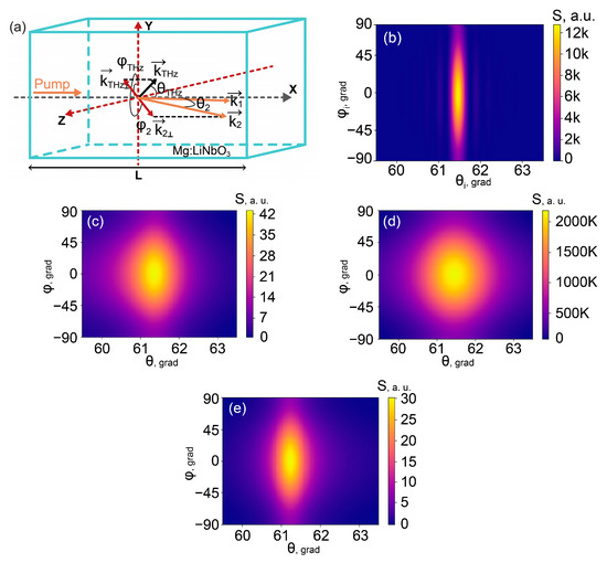 Here, stands for the spatial harmonic of the pump field with the wave vector transverse projection ; the polar () and azimuthal () angles are spherical coordinates of each wave vector (i = 1, 2, ”THz”) inside the crystal, and L is the crystal length. As shown in Figure 1a, the polar angle is measured from the pump beam direction (X axis), the azimuthal angle is counted from the Y axis, and the polar crystal axis coincides with the Z axis. In the case of a nonlinear crystal with the same 3 m symmetry as Mg:LiNbO3, all the three waves should be extraordinarily polarized along Z axis and propagate in the XOY plane (, ) to obtain the majority of the crystal nonlinear susceptibility tensor components. However, when the azimuthal angle changes significantly, one has to take into account a decrease in the working Z-projection of the corresponding field. Equation (3) accounts for a convolution of the crystal second-order susceptibility tensor with the polarization vectors of interacting waves in the form of [27]. accounts for the crystal intensity absorption coefficient at THz frequency: .