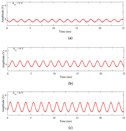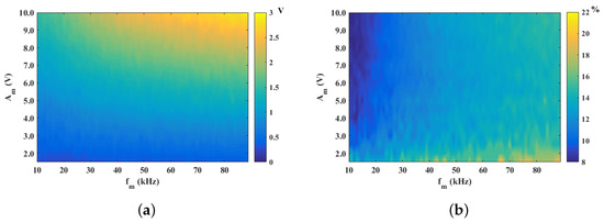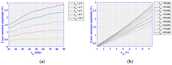 In Figure 4, we can observe that the voltage of the emission increases by increasing or , but the intensity of the emission (Figure 4a vertical color bar, given in volts (V)), does not have the same amplitude to , and only a percentage is observed Figure 4b; this relationship between the amplitude of the modulation and the amplitude of the emission is shown in Figure 5. The peak-to-peak voltage of the LD emission was calculated by varying modulation amplitude (Figure 5a) and modulation frequency (Figure 5b).