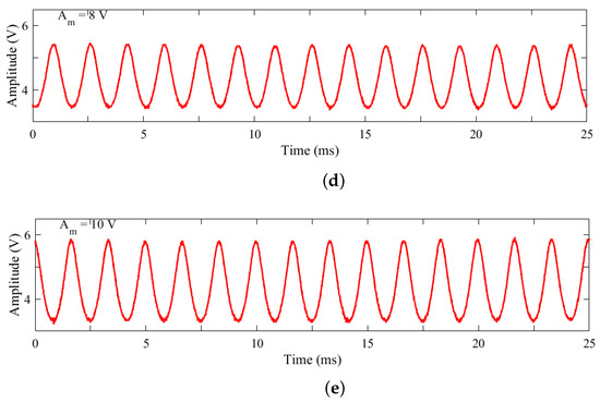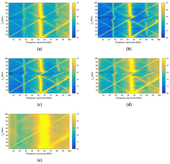 Frequency spectrum maps obtained by varying harmonic modulation frequency 1 kHz < < 100 kHz and modulation amplitude: (a) V; (b) V; (c) V; (d) V; (e) V.