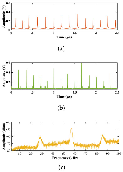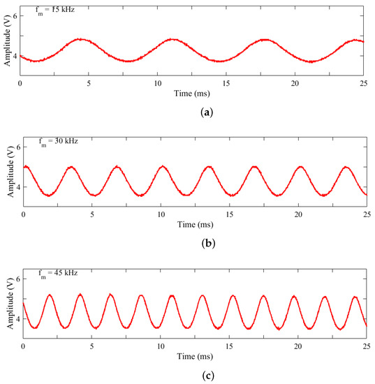 Using the experimental arrangement for the laser configuration shown in Figure 1, it was found that the pulse frequency without modulation is kHz; this is observed in Figure 8, where the parameters of the modulation signal were kept constant with voltage V and current A.