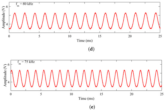 Laser diode emission by varying the harmonic modulation frequency and with fixed amplitude = 7.5 V and modulation frequency : (a) 15 kHz, (b) 30 kHz, (c) 45 kHz, (d) 60 kHz, (e) 75 kHz.