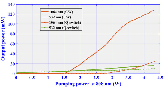 The intracavity conversion efficiency was found by relating the optical power at 532 nm to the optical power at 1064 nm. In Table 1, we can see that if the laser set-up was in the Q-switching mode, efficiency was , higher than the results in previous works [34], whereas if the laser set-up was not in Q-switching mode, efficiency was only .