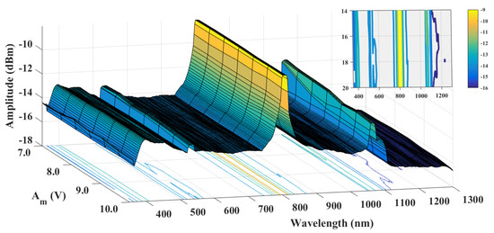 In order to analyze the laser emission, an optical spectrum analyzer was used, in which modulated and unmodulated laser measurements were made, and it was verified that, for the modulation ranges used, the laser emission lengths stay the same. Figure 7 shows the optical spectra amplitude at wavelength range 350 nm 1300 nm of the laser emission , with a modulation amplitude range 7 V < V and modulation frequency fixed to = 50 kHz to know the behavior of current output when modulating the diode current. The characteristic wavelengths of 808 nm of the pump laser diode, 1064 nm of the emission of and 532 nm of the second harmonic when using the KTP are observed. The wavelength of 350 nm corresponds to the frequency sums phenomenon of the fundamental wavelengths 1064 nm and second harmonic (532 nm).
