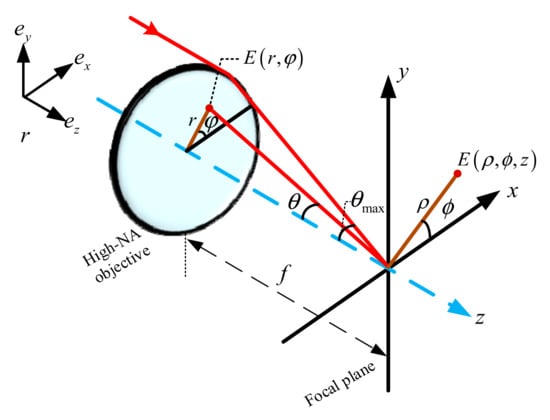 In this part, the theory for the tight-focusing of RP-RSPEPV beams with LGSM is introduced. Firstly, the schematic diagram of RP beams through a lens with high numerical aperture (NA) is shown in Figure 1.