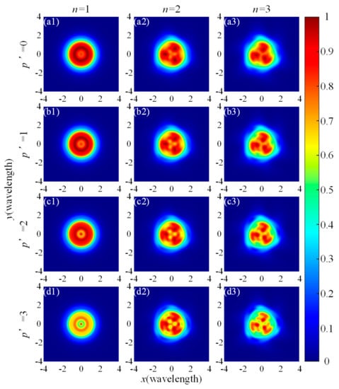 To learn more about the influence of the spatial correlation length δ and the order of LGSM p’ on the intensity distribution of RP-LG-RSPEPV after it is tightly focused, we calculated the normalized focal intensity distribution of topological charge l = 3, spatial correlation length δ = 0.005 m, and p = 1, with the change in the order of LGSM p’ and power exponent n in Figure 4. One can see from Figure 4 that the total intensity of the beam decreases when the order of LGSM p’ increases, which is more obvious when the power exponent n increases. In fact, the weakening of light intensity may reflect the weakening of coherence, because the lasers always have strong correlation and light intensity. However, this alone cannot explain why the RS-LG-RSPEPV beams have different degrees of coherence under different orders of LGSM. This can be described by the degree of coherence at the plane of z = 0, which itself can be given by