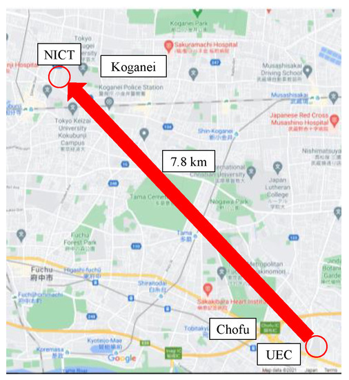 The transmission experiment was conducted over an FSO communication testbed, called the Tokyo FSO testbed. As indicated in Figure 3, this testbed connects the transmission system at the University of Electro-Communications (UEC) and the receiving system at the National Institute of Information and Communications Technology (NICT). The link distance is approximately 7.8 km.