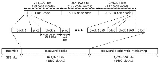 Subsequently, we divided this sequence into 1560 blocks (516 blocks for regular LDPC code and SCLD polar code, and 528 blocks for CA-SCLD polar code) with a size of 512 bits. We added a 128-bit pilot sequence, which was an iterative “01” pattern, at the end of each 512-bit sequence. CSI was estimated by averaging the received optical power for “on” symbols in the pilot. We decided on the length of pilot sequence with careful consideration: When the pilot sequence becomes longer, the precision of the CSI estimation becomes greater, whereas the transmission rate decreases. In the CCSDS standard, a series of 16 to 192 bits is typically used for synchronization [30,31]. Further, the tail sequence for LDPC codes in [30] is 128 bits. Therefore, 128 bits are used in this study.