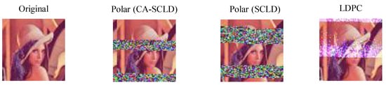 For the information data to be transmitted, we employed the “Lena” image with a size of 131,504 bits. For the CA-SCLD polar code, we divided this image into 132 blocks with a size of 1000 bits. The last 132-th block was padded with “0” bits so that its size became 1000 bits. After adding the 24-bit CRC code, the 1024-bit blocks were encoded into 2048-bit codewords and concatenated into a 270,336-bit sequence. Similarly, for SCLD polar code and regular LDPC code, we divided the Lena image into 129 blocks of size 1024 bits. After zero-bit padding to the last block, these 1024-bit blocks were encoded into 2048-bit codewords and concatenated into a 264,192-bit sequence. We concatenated the 264,192-bit sequences for regular LDPC code and SCLD polar code and the 270,336-bit sequence for CA-SCLD polar code.