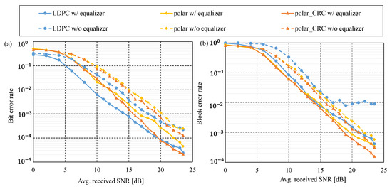 Figure 6 demonstrates that the curves with channel equalization (solid lines) clearly surpass those without equalization (dotted lines) for both BER and BLER. The BER gain of channel equalization was approximately 4 dB with SNR = 20 dB. In addition, the error floor in the LDPC BLER, which occurs due to residual bit error generated by the sum-product algorithm, disappeared when channel equalization was applied. These observations indicate that channel equalization significantly improves the error correction performance of the polar and LDPC codes. Next, we investigate the BER and BLER performances with channel equalization.