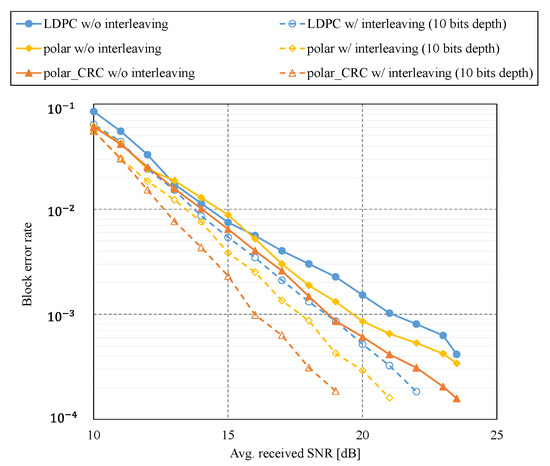 In Figure 7, we show the BLER performance of three error-correcting codes without block interleaving (solid lines) and with block interleaving (dashed lines). The result demonstrates that block interleaving improves the performance because the interleaver spreads burst errors and improves the LLR quality in the decoding process.