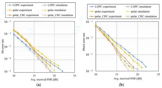 Figure 6a,b displays the bit error rate (BER) and block error rate (BLER) of the experimental data as functions of the average SNR at the receiver. For the cases without channel equalization, we subtracted the received voltage by 1/2 of the average when “on” was transmitted to the pilot symbol to mitigate the degradation due to the asymmetry of the LLR distribution [17].