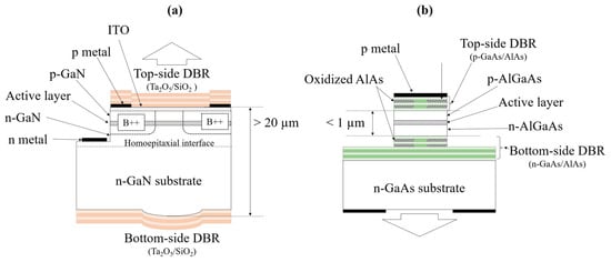 However, the fabrication of GaN-based VCSELs is not necessarily easy. Nitride with high aluminum content suffers from high activation energy for p-type dopants [6], which toughens the formation of conductive p-type DBRs. Achieving conductivity with n-type GaN-based DBRs is still underway with respect to improvements in large band offsets between these materials [7]. These challenges compel researchers to use intracavity contacts covered by dielectric DBRs for the p-side [5,7] and to insert a relatively thick n-spacer between the quantum well and bottom-side DBRs to attain the current path from the n-side (see Figure 2a).