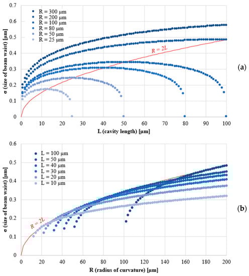 The author relates the cavity’s dimension to the resonant modes’ lateral optical behavior. An analytical formulation describing the waist size of a Gaussian beam was given by Kogelnik [22]: