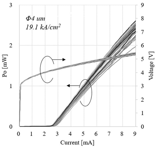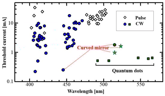 The series of research revealed the merits of this cavity structure. As evidence of the fabrication stability against dimensional errors, a 100% yield of lasing and the high uniformity of I-V/L have been reported. The standard deviation of Ith and the maximum output power was 6.1% and 5.1%, respectively [31]. Figure 7 shows the updated data on the uniformity of blue VCSELs with a curved mirror. It shows that 55 chips showed uniform I-V and I-L, and the calculated maximum efficiency among these was about 15%. We obtained these chips in a centimeter-wide area. Figure 8 shows how the Ith of GaN-based VCSELs is dependent on the wavelength. VCSELs with curved mirrors show a low threshold current, which is another piece of evidence for this cavity’s superiority, such as its ability to eliminate diffraction loss.