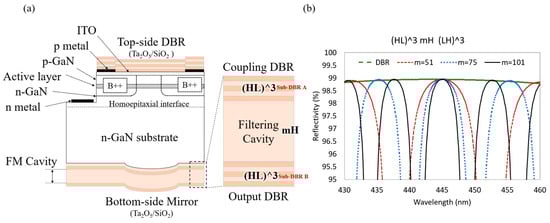 The schematic of a curved mirror VCSEL (a) with a bottom-side filtering mirror. The reflectivity spectrum of three different filtering mirrors (b) with a reference wavelength of 445 nm and cavities of m = 51, 75, and 101.