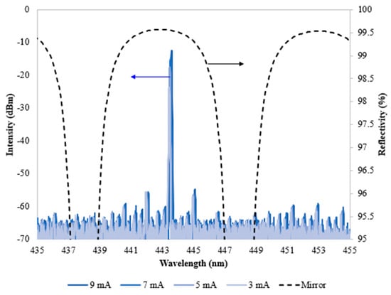 Although applications are waiting for the advent of visible VCSELs in the industry, challenges remain. One issue is a lack of longitudinal mode control. The extremely long cavity of the device often leads to multimodal emission or mode hopping during operations, which is a drawback for certain applications, as atomic clocks or any devices with components require severe wavelength sensitivity. In 2022, we allowed an etalon with considerable modulation in the reflectivity spectrum to replace one of the DBRs and observed the firm stabilization of emission wavelengths with a side mode suppression ratio (SMSR) of 40 dB or more [32]. The reflectivity modulation of the etalon imposes different degrees of optical penalty to each longitudinal mode and automatically selects one with the lowest penalty (see Figure 9 and Figure 10). By setting the peak reflectivity to as high as 99%, we can attain the stabilization of longitudinal modes with mill-watt class output power. The research on this topic is in its preliminary phase and leaves a minor issue. For example, the etalon itself exhibits a minor absorption of light, which sometimes, for example, halves the slope efficiency [42].