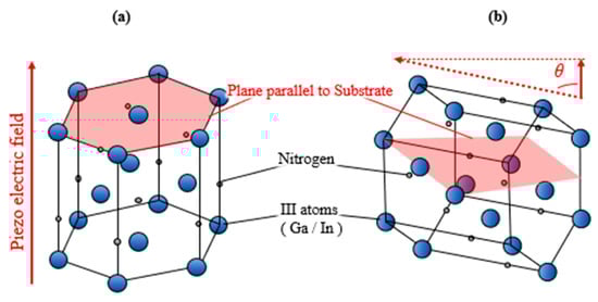 (a) The {0001}-orientated, or so-called c-orientated, lattice is shown. (b) The {20–21}-orientated lattice is shown. The {20–21} lattice is obtained by rotating the {0001} lattice by 75 degrees towards the m direction. The rotation of the crystal reduces the piezoelectric field normal to the substrate, thereby suppressing the QW degradation for high indium incorporation.