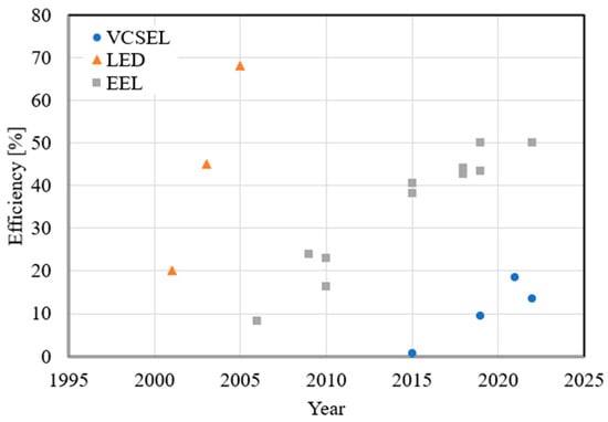 The efficiency of GaN-based VCSELs is relatively low among the types of light emitters. The scientific and quantitative discussion of the marginal performance of the device is still underway. This section tries to observe the perspective of the efficiency of GaN-based VCSELs via an empirical approach. Figure 12 shows the trend of the wall plug efficiency of blue LEDs, edge-emitting lasers (EELs), and VCSELs. This figure illustrates that the improvement in VCSELs is at a similar pace as the past pace of EELs. That may give one the impression that VCSEL’s efficiency will follow this trend in the coming years, hopefully at around 40% in 2030.