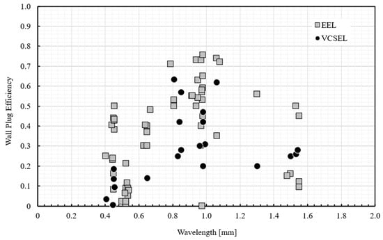 Reading how the efficiencies of EELs and VCSELs depend on wavelengths leads us to another point (see Figure 13). This trend illustrates two aspects; (i) the efficiency of VCSELs is lower than EELs for all ranges of wavelengths, and (ii) the degree of behind in efficiency is relatively considerable for shorter and longer wavelengths. Discussion around the cause of this generally requires complicated analyses considering various parameters. One aspect of simplifying the discussion is remarking on the geometrical difference in these devices’ electrical (carriers) and optical (photons) paths. They are parallel and have more geometric overlap in VCSELs. At the same time, they are orthogonal, and have less overlap in EELs, enhancing the optical impact in VCSELs associated with implementing current paths. For instance, one significant way to establish conductivity is doping on semiconductors. This is associated with plasma absorption, which is generally prominent in the infrared region and diminishes in the near-infrared region. This is consistent with the trend that VCSELs have greater plasma absorption relative to EEL around the region between 1.2 and 1.6 mm. Looking back at GaN-based VCSELs, although plasma absorption is negligible, the inter-band absorption of materials is serious. Intracavity contacts are required to circumvent electrically insulated DBRs. For instance, indium tin oxide (ITO) is often the current path at the top side. ITO’s inter-band transition causes a certain amount of loss even at visible regions, which degrades the cavities’ Q factor to reduce efficiency [43]. Recent research is reporting structures where the tunnel junction (TJ) and n-GaN current spreader replaces ITO, and such a structure reduces optical loss toward better I-L curves [44]. One issue with introducing TJ has been an operational voltage increase that is as considerable as around or over one volt, which is caused by the wide band gaps of nitride materials. Recently, the voltage was reduced to as low as standard VCSELs with ITO [45]. Additionally, a report indicated that VCSELs with TJ have a longer life than those with ITO [46].