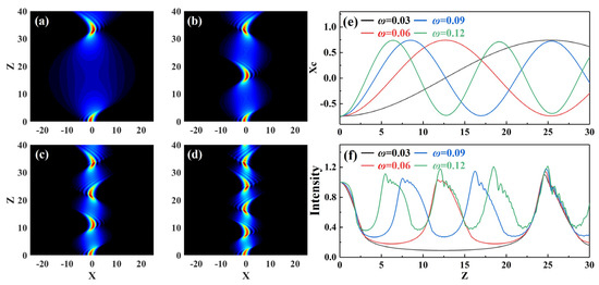 The modulation frequency ω of the inhomogeneous medium is an important parameter affecting breathing speed. Simulations were performed to investigate the effect of the modulation frequency on the breathing solitons created by the Airy beam. Figure 2 shows the propagation of an Airy beam in an inhomogeneous medium with different modulation frequencies when truncation coefficient a0 = 0.3 and modulation intensity P = 10. Figure 2a–d show the propagation characteristics of the intensity of an Airy beam. Figure 2e,f show the changes in the center of mass and intensity of the Airy beam, respectively. When propagating into an inhomogeneous medium, an Airy beam could be bound to the inhomogeneous medium for stable propagation, and form breathing optical solitons with periodic sigmoid oscillations (Figure 2a–d). The breathing solitons show local characteristics in the spatial distribution direction, and periodic breathing characteristics in the propagation direction. As modulation frequency ω increases, for the same longitudinal propagation distance (Z = 100), the pulsation period gradually decreases, and the frequency gradually increases (Figure 1e,f). Modulation frequency ω can slightly change the maximal intensity of the breathing solitons (Figure 2f). Breathing solitons conserve energy throughout the propagation. The above analysis shows that the breathing period of Airy spatial solitons can be controlled by changing the lattice modulation frequency. The numerical simulation results of the breathing period of the Airy spatial solitons were basically consistent with the theoretical analysis in Formula (16).