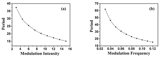 The period of the Airy beam propagating in inhomogeneous medium with periodic potential was calculated. The relationship between the two characteristic parameters of the medium and the period of the Airy breathing soliton show that the period of the Airy breathing soliton monotonously decreased with the increase in modulation intensity (Figure 3a) and modulation frequency (Figure 3b); the rate of the decrease in the breathing period was rapidly reduced. The above analysis shows that the period of Airy breathing solitons could be controlled by changing the characteristic parameters of inhomogeneous media. The statistical numerical simulation results of the Airy breathing soliton period were basically consistent with the theoretical analysis in Formula (16).
