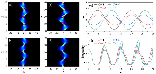 Initial chirp C is an important characteristic parameter of Airy beams, and a numerical simulation study was conducted to explore its effects on breathing soliton production by Airy beams. Figure 4 shows the propagation diagram of Airy beam with different initial chirps in an inhomogeneous medium when truncation coefficient a0 = 0.3, modulation intensity P = 10, and modulation frequency ω = 0.1. Figure 4a–d show the propagation characteristics of the intensity of an Airy beam, and Figure 4e,f show the changes in the center of center of mass and intensity of an Airy beam, respectively. The results show that, as the initial chirp C increased, the propagation dynamics of the Airy beam also changed with vibration. As chirp parameter C increased, both the maximal central position (Figure 4e) and the maximal oscillation amplitude of the Airy beam (Figure 4f) increased. However, in the propagation process, the propagation characteristic frequency remained unchanged, while the multipeak structure became inconspicuous. When the absolute values of the chirp parameters were equal, the corresponding maximal oscillation amplitude was the same, but the Airy beam was deflected in the opposite direction, while its shape and motion state were the same (Figure 4e). Meanwhile, the energy of the breathing solitons was conserved throughout the propagation. The above analysis shows that the direction, magnitude, and maximal intensity of the spatial soliton deflection could be controlled by changing initial chirp C of the Airy beam.