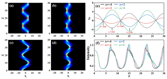 By choosing an appropriate initial transverse position x0 of the Airy beam in inhomogeneous media, the direction of the binding force on the beam caused by the nonlinear force of the periodic potential can be changed. To investigate the effects of initial transverse position x0 on the generation of breathing solitons with an Airy beam, numerical simulations were conducted. Figure 5 shows the propagation of an Airy beam with different initial positions in an inhomogeneous medium when truncation coefficient a0 = 0.3, modulation intensity P = 10, and modulation frequency ω = 0.1. When x0 < 0, the Airy beam was deflected in a negative direction from its lateral negative in the first half period, but in a positive direction from its lateral position in the second half period (Figure 5a,b). The deflection direction of the Airy beam was the opposite of the deflection direction when x0 < 0 (Figure 5c,d). Even if the transverse position of an incident Airy beam does not overlap with the nonlinear potential, Airy beams could periodically reproduce their initial envelope shape during propagation in order to attain properties such as being diffraction-free over long distances. The Airy beam had a side lobe to the left of the main lobe during its initial propagation. However, when the propagation distance was the ¼λ ≤ z ≤ ¾λ cycle, the side lobe was located on the right-hand side of the main lobe. Moreover, when the propagation distance was the ¾λ ≤ z ≤ λ period, the side lobe was again on the left-hand side of the main lobe due to the periodic potential Airy beam leading to two reversions of the intensity distribution. The above analysis implies that the deflection direction and size, and the maximal intensity of the spatial solitons can be controlled by changing the initial position x of Airy beams.