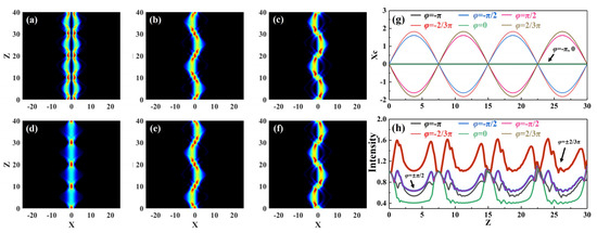 Figure 6 shows the interaction diagram of positive/negative Airy beams with different values of initial phase φ when truncation coefficient a0 = 0.3, initial amplitude A1 = A2 = 1, modulation intensity P = 10, modulation frequency ω = 0.1, and initial interval B = 1. When φ = 0, the Airy beams propagated in the same phase, resulting in a mutually attractive force. Because B = 1, the positions of the main lobes of the two Airy beams basically coincided, and the attraction of the interaction between two Airy beams was the strongest. Therefore, almost all of the energy of the two Airy beams converged at the central position, where the breather was formed (Figure 6d). When φ = π, the Airy beams propagated in the reverse phase, and the interacting force was repulsive. In the propagation, when the repulsive force was balanced with the binding force of the periodic potential well, the energy was evenly distributed on both sides, forming the double soliton phenomenon of periodic breathing (Figure 6a). When the initial phase took on other values, the energy of the Airy beams underwent an S-shaped lateral deviation, resulting in its energy being alternately distributed on both sides of the center of the transverse position within the same period (Figure 6b,c,e,f). When −π < φ < 0, the Airy beams first deflected to the right-hand side of the transverse position and then periodically propagated in an S-shaped trajectory (Figure 6b,c). When 0 < φ < π, the propagation situation was exactly the opposite to that when −π < φ < 0 (Figure 6e,f). The larger the φ was, the larger the central position deflection (Figure 6g) and maximal intensity (Figure 6h) of Airy beams are.