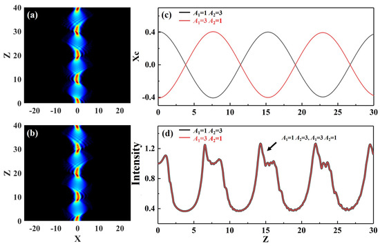 Figure 7 shows the interaction diagram of two Airy beams with opposite spatial positions with truncation coefficient a = 0.3, modulation intensity P = 10, modulation frequency ω = 0.1, initial interval B = 1, initial phase φ = 0, and initial amplitude A1 ≠ A2. When A1 ≠ A2, the interaction of the Airy beams is affected, and the stronger beam amplitude dominates the interaction, as can be seen in Figure 7a,b, resulting in changes in the propagation characteristics of the interaction. When A1 > A2, the central position of an Airy beam first deflected to the left and then to the right when it encountered the potential well of the lattice. When A1 < A2, the deflection direction was opposite to that when A1 > A2 (Figure 7c). The propagation characteristics of the amplitude of Airy beams were consistent when A1 = 1 and A2 = 3 and when A1 = 1 and A2 = 3.