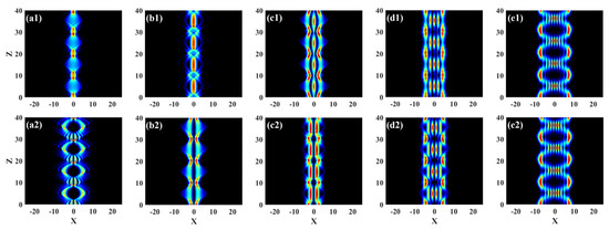Figure 8 shows the interaction diagram of two Airy beams with opposite spatial positions with different values of initial interval x0 when truncation coefficient a0 = 0.3, initial amplitude A1 = A2 = 1, modulation intensity P = 10, modulation frequency ω = 0.1, initial phase φ = 0, and two in-phase Airy beams attracted each other (Figure 8a1–e1), and two antiphase Airy beams repelled each other (Figure 8a2–e2). First, the interaction between two Airy beams at the same direction and different intervals was studied. When x0 = 3, due to the mutual attraction, the energy of the main lobe of the Airy beams converged near the central position to form breathers. The attraction between the side lobes was weak, and the energy that it radiated outwards was also bounced back after meeting the potential well to form symmetric tails on both sides (Figure 8c1). As the interval between tnhe main lobes gradually decrease, the energy of some side lobes also converged to the central position, and the number of the breathing solitons gradually decreased (Figure 8a1,b1). When x0 = 0, the space between the main lobes was small, and the energy of the two Airy beams was concentrated near the central position to form breathers (Figure 8a1). With the increase in x0, the space between the main lobes gradually increased, and the number of produced breathing solitons increased due to the interaction between the Airy beams (Figure 8c1,d1). Second, the interaction between two reverse-incident Airy beams at different intervals was studied. When x0 = 3, the energy of the Airy beams transmitted in the opposite direction converged to form two breathing solitons near the central position due to the repulsive force. Meanwhile, the energy of the main lobes of the two beams was symmetrically distributed on both sides (Figure 8c2). Significantly, the reverse-incident Airy beams displayed multiple breathing solitons at all values of initial interval x0.