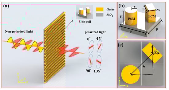 The desired metasurface structure (polarizer) shown in Figure 1a consisted of the period unit cell. It can change random light into linear polarized light with a desired direction, such as 0°, 45° 90° and 135°. The unit cell comprises one PCM and one PSM, made of GaAs, which are placed on a substrate. PCM and PSM are placed on the diagonal line of unit cells, respectively. A PCM that is GaAs material with a subwavelength-thick nanopillar can functionally operate as truncated waveguides allowing certain modes with polarization-dependent effective indices to propagate. By carefully designing the lateral dimensions and orientation of the PCM, π phase difference between two orthogonal polarizations can be obtained. Therefore, it is possible for PCM to achieve a metamaterial half-wave plate with the function of linear polarization conversion. At the same time, PSM plays an important role in improving the efficiency and accuracy of polarized light transmission, which can be used for large-scale and high-precision phase modulation while maintaining the polarization state of incident light. In addition, by combining PSM with PCM into one unit cell, this structure can not only adjust the major polarization angle of the outgoing light with quite small steps (<1°), but also can hold the promise of providing a greater degree of freedom in metasurface design. Furthermore, compared to existing metamaterial structures [,,], our diatomic metasurface based on GaAs has a comparative advantage in transmittance efficiency. In addition to that, by carefully designing a diatomic metasurface composed of PSM and PCM, there are broad potential applications in the integration of waveplates and some optical components, such as lenses, beam splitters, parabolic reflectors and so on.