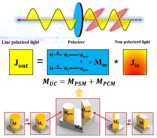 By analyzing the equation of and , it can be concluded that a suitable PSM and PCM combination can be equivalent to a linear polarizer with a polarization angle equal to the rotation angle of the PCM. The schematic diagram of the transmission matrix is shown in Figure 2.