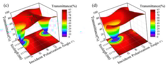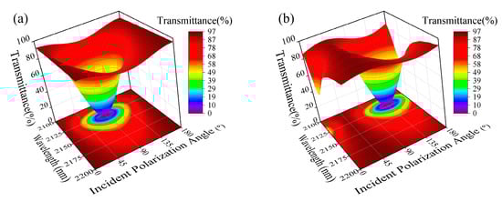 To obtain the selected operating wavelength, the incident light source was selected from 2100 nm to 2200 nm and the parameters scanned the effect of the polarization angle of the light source from 0° to 180° on their transmittance, as shown in Figure 3a. When the linear polarizer is near the wavelength of 2125 nm, the contrast between the transmittance and the polarization angle of the incident light source is relatively large. Therefore, the 2125 nm light source is selected as the incident light source in the follow-up work to design a higher-performance linear polarization device.